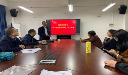 2022年11月8日,智慧医技学院在药学名师工作室召开全院教职工大会,宣传学习贯彻党的二十大精神,讨论人才工作规划。校党委委员、智慧医技学院教党支部书记张晓玲和我院全体教职工参加了会议。