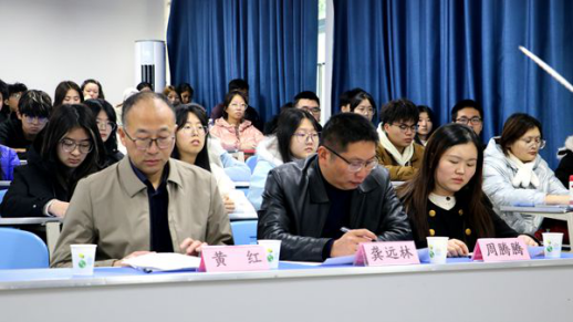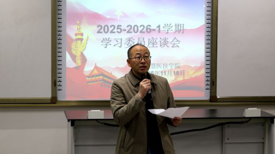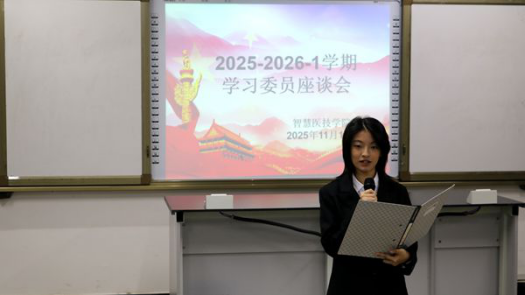 2025年11月18日中午,智慧医技学院在仲景楼阶梯教室召开2025-2026学年第一学期学委座谈会,2024级、2025级学习委员及学院领导、教师代表参会。会议由学生张祉琪、张琼文主持,介绍出席的龚远林院长、黄红书记等领导及教师。