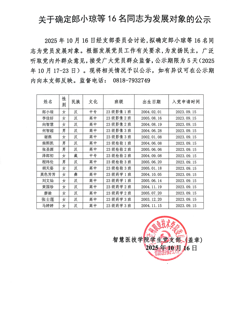智慧医技学院学生党支部关于确定郎小琼等16名同志为2025年秋季党员发展对象的公示