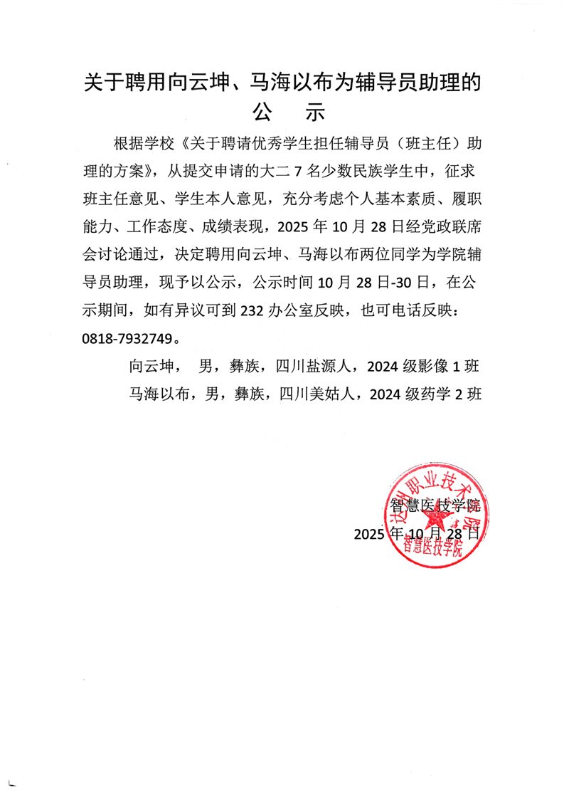 智慧医技学院关于聘用向云坤、马海以布为辅导员助的公示