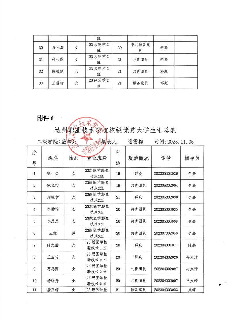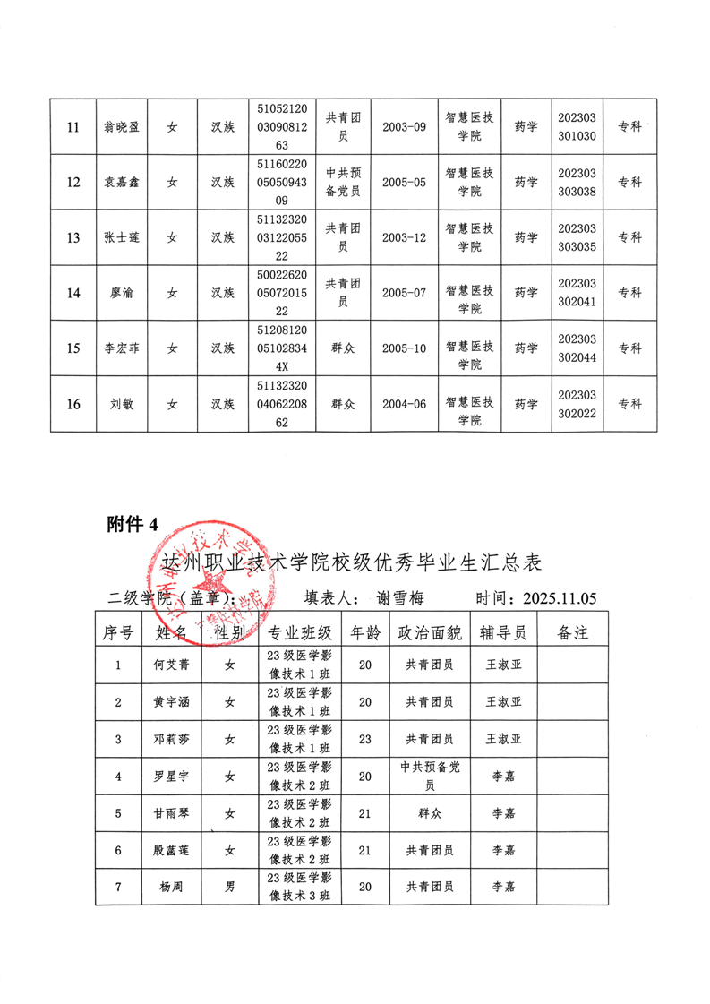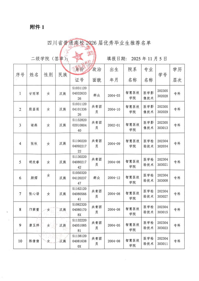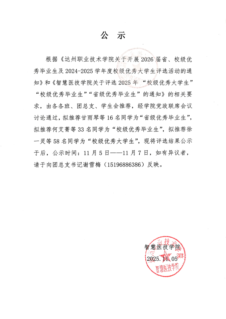 智慧医技学院关于2026届省、校级优秀毕业生、2024-2025学年度校级优秀大学生拟推荐人选公示