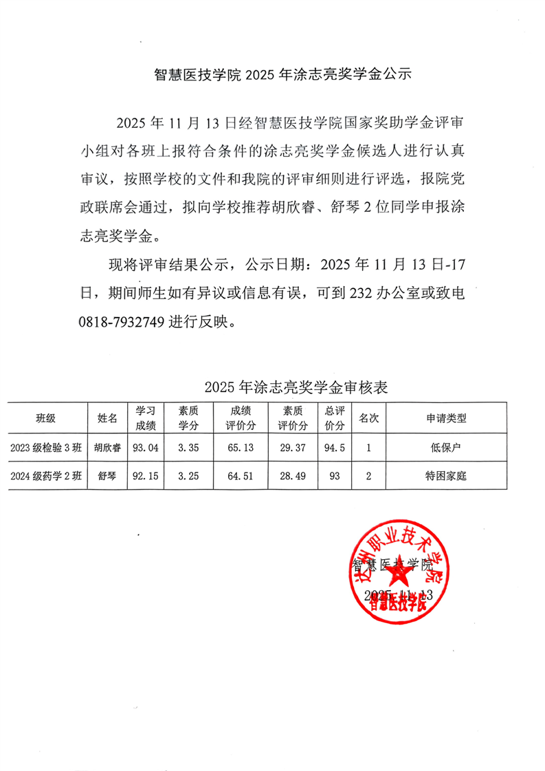 智慧医技学院2025年涂志亮奖学金推荐人选公示