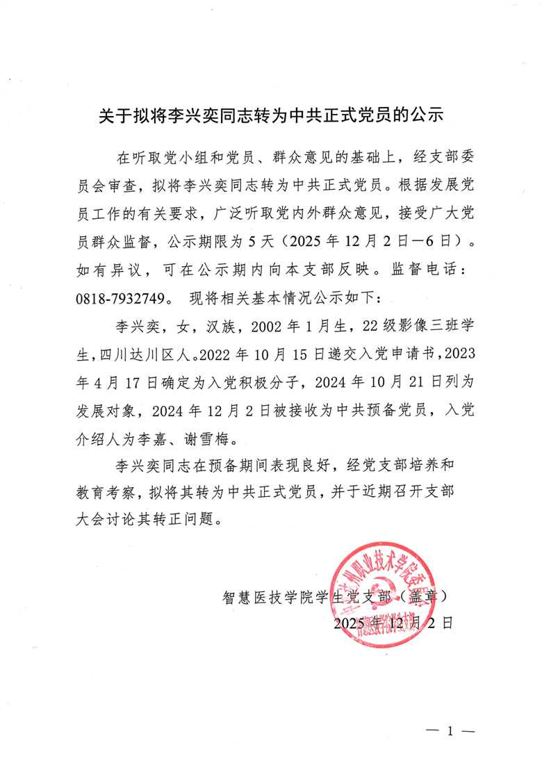 智慧医技学院学生党支部关于拟将李兴奕同志转为中共正式党员的公示